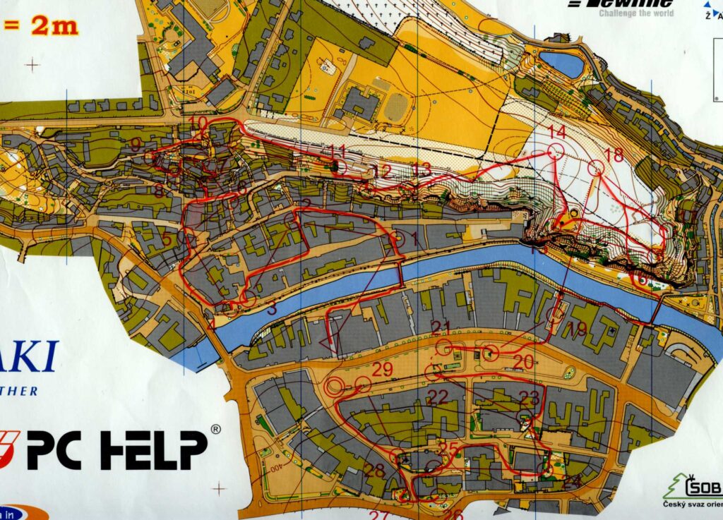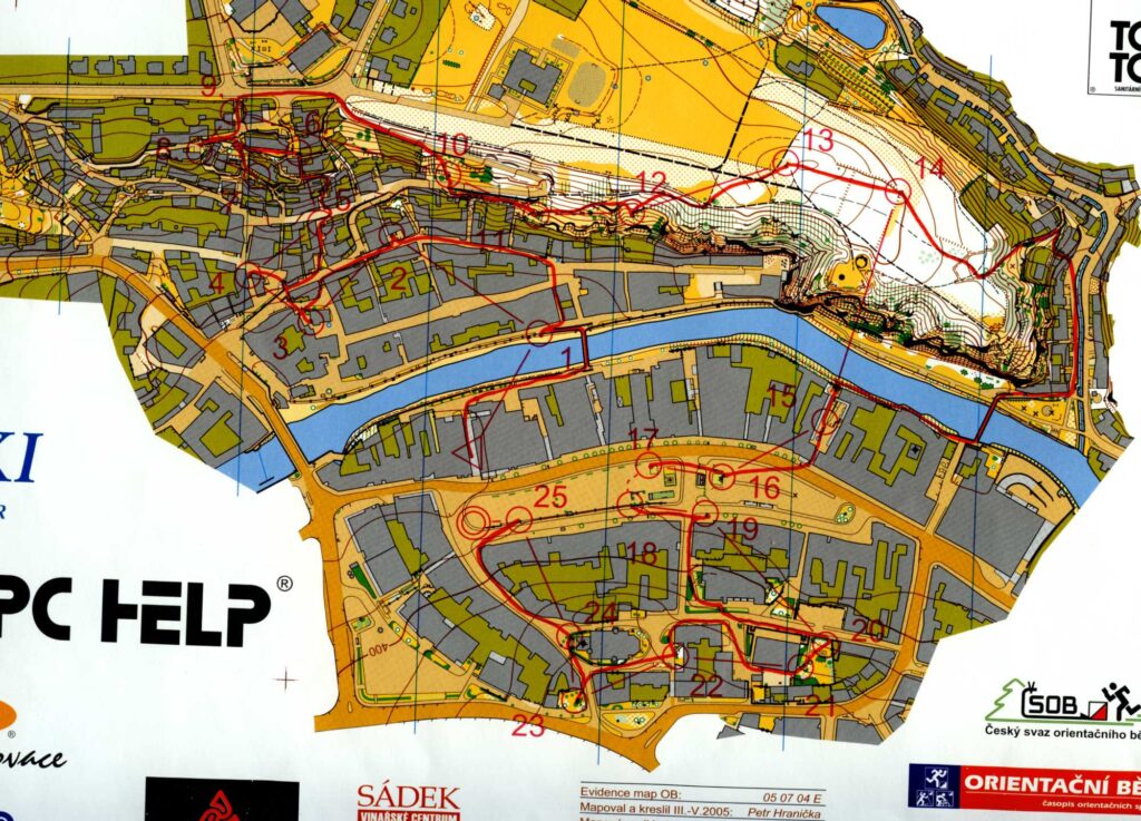 Tehdy se sprintové tratě stavěly úplně jinak. Byly to spíš takové parkáče. Stavěl jsem to jako „zážitkový běh“ v úzkých uličkách s několika mikrovolbami a jedním královským postupem na 19. kontrolu u mužů a 15. kontrolu u žen. Nejlepší postup tehdy myslím jako jediný objevil Ropák – byl hodně kontraintuitivní, vybíhalo se skoro o 180 stupňů od směru spojnice. Navíc se běhalo de facto podle lesního klíče, takže se nerozlišovala překonatelnost a nepřekonatelnost jako dnes. Pamatuji si, jak nás šokoval Olaf, který tehdy neuvěřitelně seskákal strmé skály nad řekou. To by dnes podle sprintového klíče už vůbec nešlo. (o tom se více dočteš v článku MČR se po 21 letech vrací do Třebíče. Jak na něj vzpomínají medailisté?)