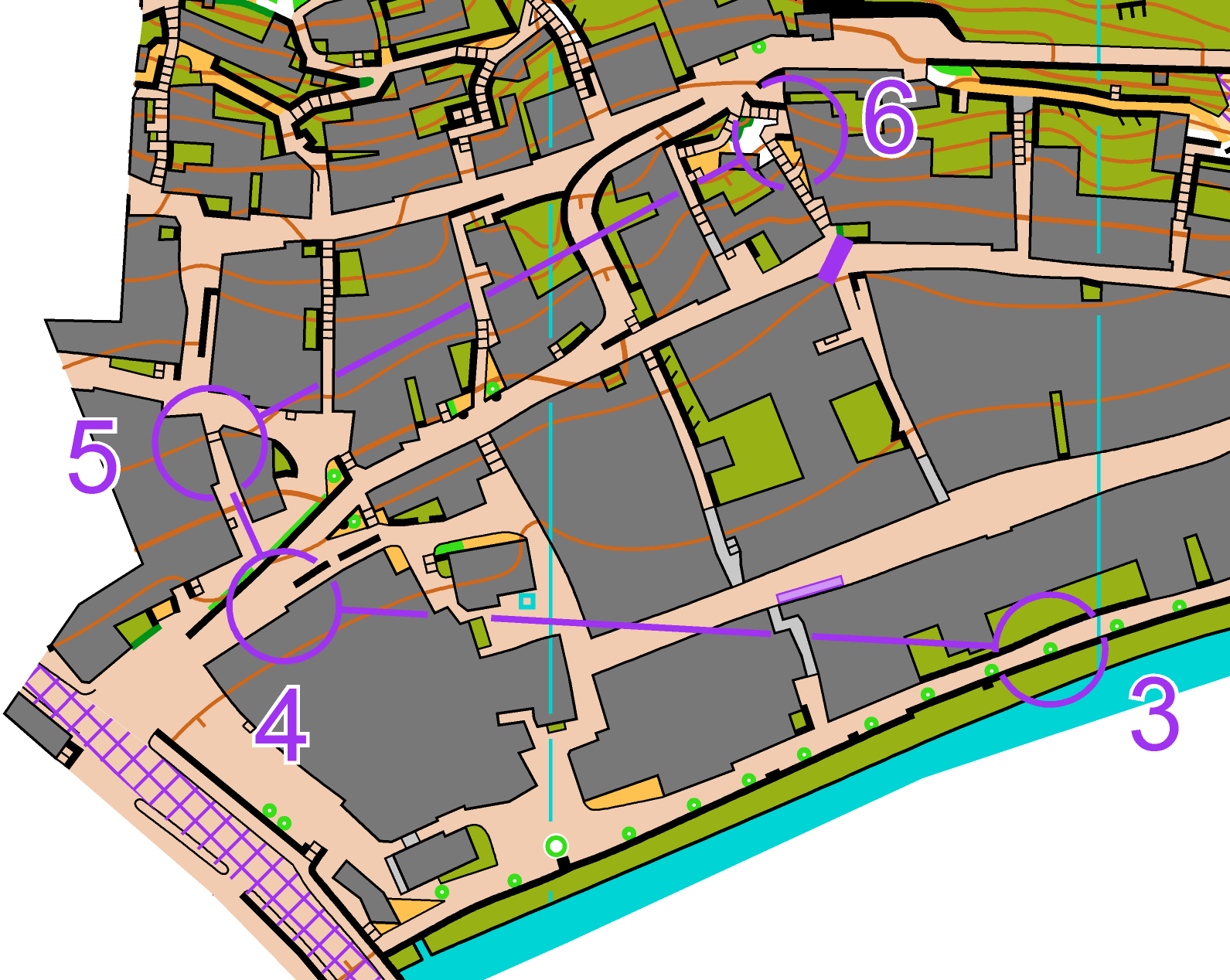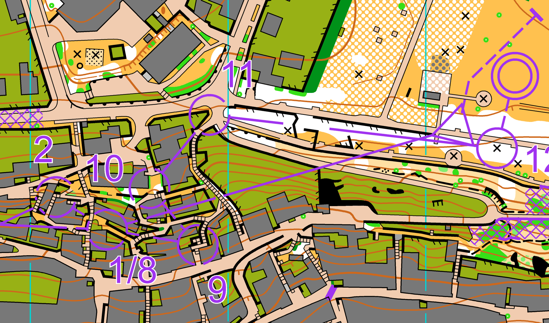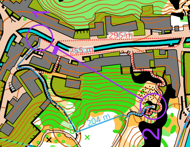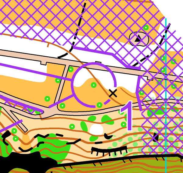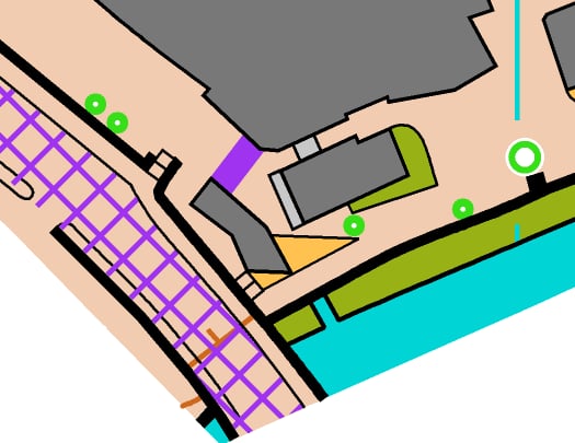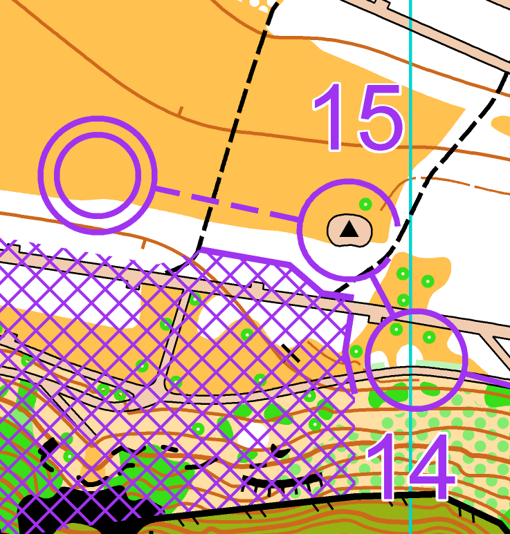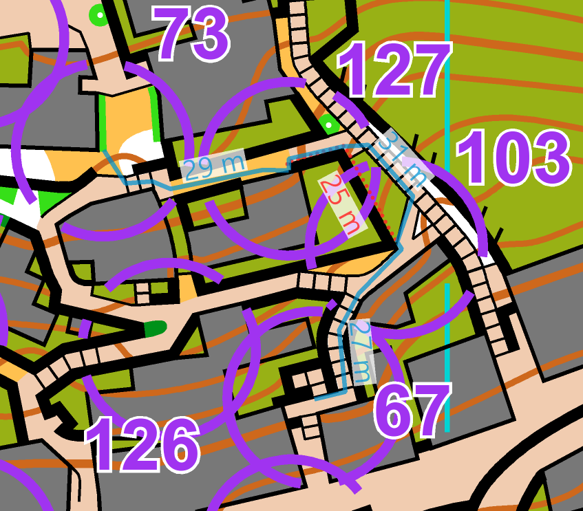 Kontrol bylo v terénu opravdu hodně a samozřejmě jsme velmi řešili minimální vzdálenosti. V tomto nám ohromě pomohla změna pravidel, která nově odstranila nesmyslnou větu o kontrolách ve vzdálenosti do 30 m na podobných objektech ve sprintových disciplínách. Pod 15 m jsme samozřejmě žádné kontroly neměli, takže jsme jen opakovaně museli měřit realizovatelnou vzdálenost 25 m, na kterou OCAD (zatím) nemá nějakou šikovnou funkci.