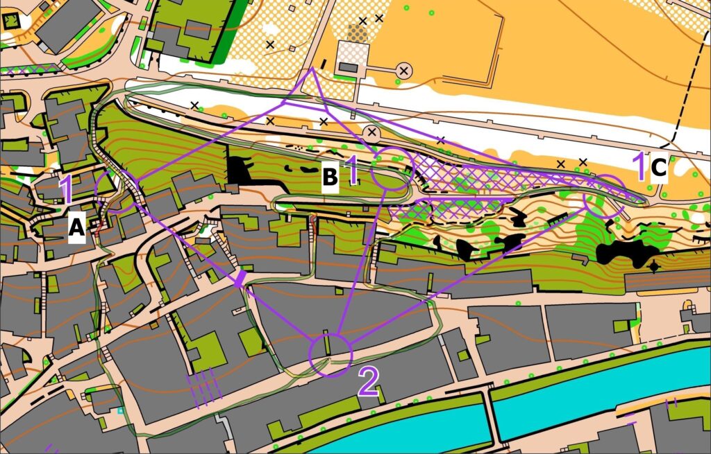 Proběhl jsem varianty s následujícími časy: A = 1:52, B = 2:07, C = 2:05. To je solidní začátek. Přemkovy časy vychází podobně, akorát v jednom běhu zaběhl do zavřeného průchodu, se kterým se pro závod počítá, ale standardně bývá zavřený. Zdá se to docela vyrovnané, a tak potvrzujeme Danovi, že takto self choice funguje a dá se na tratích pracovat dál.