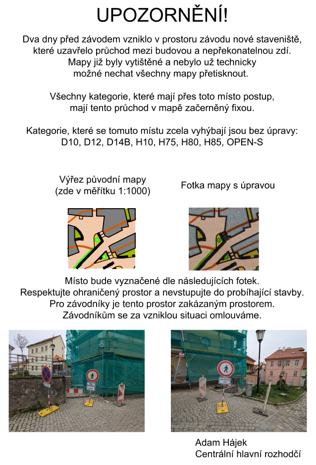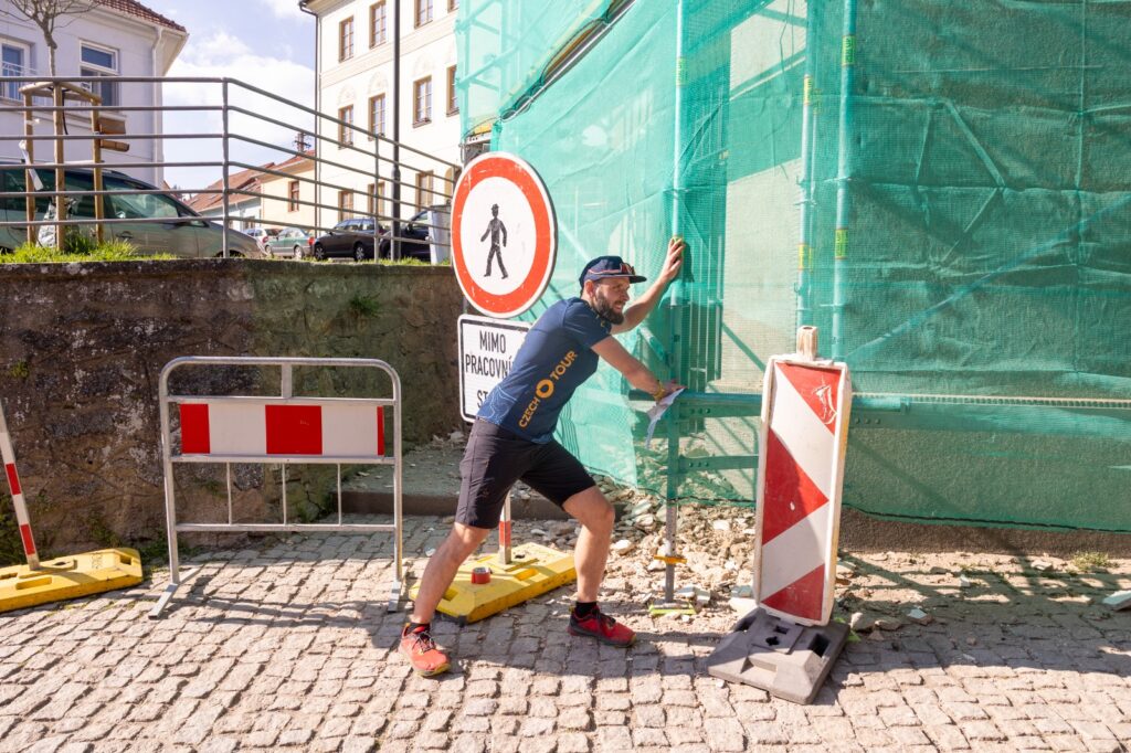 To by nebyl sprintový závod, aby se těsně před ním něco nerozkopalo. Je to takové zlaté pravidlo sprintů a opět se to potvrdilo. Následující hodinu jsme strávili skoro celou telefonicky na ose ředitel – hlavní rozhodčí – stavitel. Přemýšleli jsme, jaké máme možnosti. Nám s Danem to přišlo samozřejmě jako jasné, že se lešení rozebere, nebo zúží tak, aby se hlavně dalo proběhnout, ale z druhé strany to takto pozitivně nevypadalo. Radek na místě mluvil i s paní, které dům patří a ta se neskrývala s tím, že tam má oficiální zábor, který si nějak speciálně vyběhala na úřadech, a že se mělo lešení stavět až za dva týdny, ale zvládlo se to nakonec takto brzo, takže je spokojená. Náš tým dokonce ještě v předchozím týdnu zjišťoval na úřadech, zda se ve městě něco neplánuje, ale odpověď byla negativní. I proto nás to tolik překvapilo.