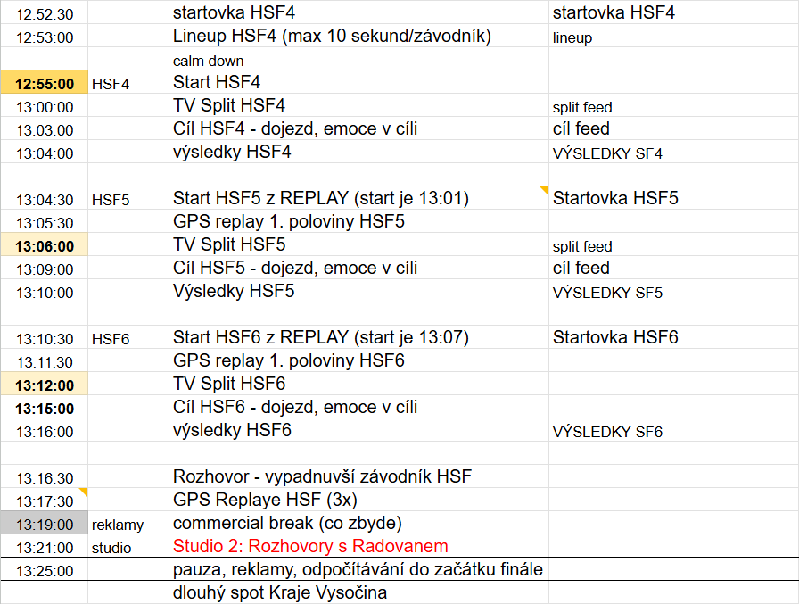 U mužské trati jsme měli výhodu, že ji proběhl Tomáš Prášil, u kterého jsme očekávali, že se nejrychlejším v semifinále přiblíží poměrně přesně. Delší dobu jsem analyzoval jeho gpx záznam v QuickRoute, než jsem se ustálil na rozestupu 6 minut. V ideálním případě by tedy měl harmonogram vypadat následovně. V čase 00 vystartuje první skupina, v 06 druhá skupina, v 08 doběhne první, ve 12 vystartuje třetí, ve 14 doběhne druhá a ve 20 doběhne třetí. Tak a bude toto pro stream zvládnutelné? A bude to zvládnutelné pro mě? Chtěl jsem být u všech doběhů na cílovou čáru, ale taky u všech self choiců, to znamenalo být u konírny ještě o minutu dřív, než se startuje. Nakonec jsem vyhodnotil, že se to dá, což se později potvrdilo i na místě, protože jednotlivé události na sebe přímo navazovaly a já jsem jen přecházel, či spíš přebíhal mezi startem a cílem.