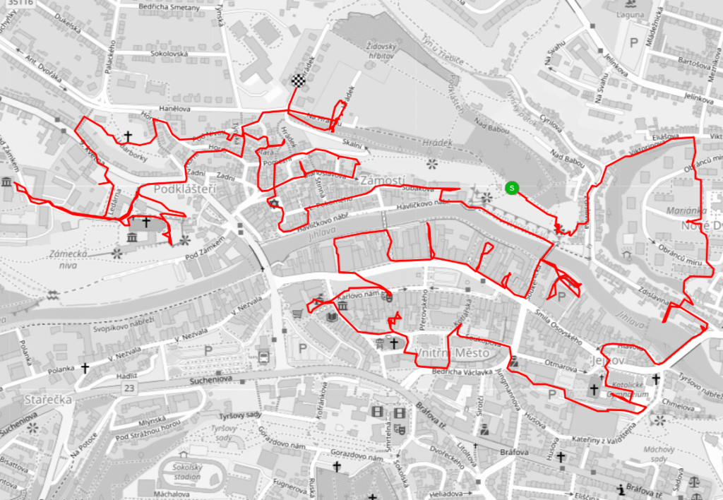 Fajn, tak mužské rozestupy máme, ale jak to udělat u ženské trati, tu totiž nikdo neprobíhal a je vlastně podstatně kratší než ta mužská a mohlo by se stát, že 6 minut zde bude moc. S výpočtem mi nikdo moc nechtěl pomoct a stream potřeboval mít přesný harmonogram, ostatně taky jsme ho museli uvést v pokynech. A tak jsem se rozhodl vzít situaci do vlastních rukou a při své poslední návštěvě Třebíče před závodem ženské SF proběhnout. Bylo mi jasné, že tempo budu mít asi o něco pomalejší, zejména při stoupání schodů, ale zas jsem si říkal, že nebudu muset moc mapovat, takže by se to mohlo trochu srovnat.