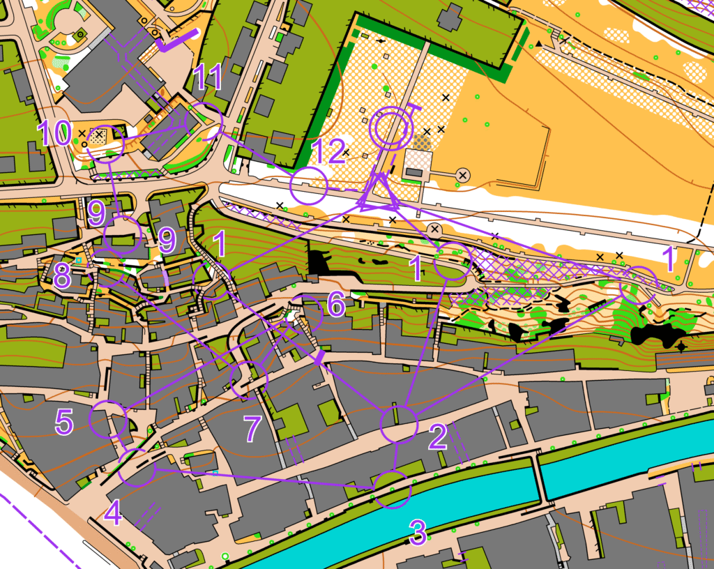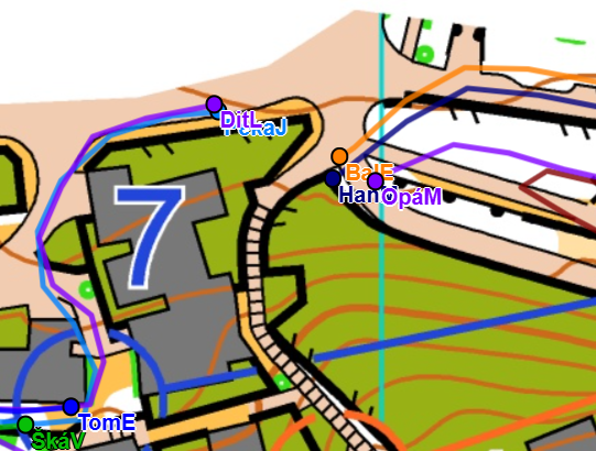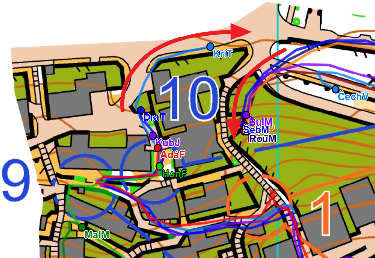 Sekce 2-6 v mužské trati pak byla zcela identická k tomu, co se použilo pro závod (až na změnu, ke které se dostanu později). Druhý větší rozdíl je pak na konci trati, kde jsme zcela vyloučili nevhodný úsek 10-11 mimo jiné proto, že na louku s arénou byl přísný zákaz vjezdu nákladních vozidel a nebylo možné umístit toiky jinam, než na plochu před školou. Prodloužení pak nastalo návratem do spodnější části Židů z K6.