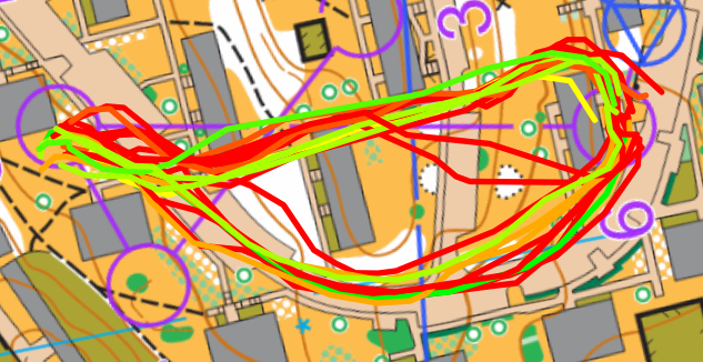 Vše jsem si namapoval dopředu, takže to, že jsem běžel s mapou mi nakonec možná jen kazilo aerodynamiku, protože jinak byla mapa už fakt nepotřebná. Postupy jsem záměrně zvolil takové, abych se co nejvíce potkával cestou dolů a pak nahoru. V cíli se hodinky zastavily na čase 7:49 (trať dámského SF se pak ještě kvůli lešení lehce zkrátila). Při rozestupu skupin 5 minut jsem měl na prvním rizikovém místě rezervu 15 s, na druhém 45 s. Při rozestupu 4 i 6 minut už vždy docházelo k setkání skupin. Nebylo tedy jiné řešení, než dát 5 minut a pak už jen doufat, že se skupiny nepotkají.
