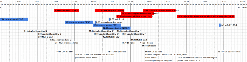 Časově to bude ale znamenat využít den na maximum – nejdřívější akceptovatelný čas startu jsem vyhodnotil jako 9:00 a z druhé strany nás omezoval západ slunce, který stanovil nepozdější konec posledního závodu na 18:40. Do tohoto prostoru budeme muset vtěsnat 5 závodů. Bylo potřeba dobře promyslet, jak zvládneme prostor vytížit a kolik si vlastně můžeme dovolit do prostoru poslat závodníků. Pomocí různých výpočtů a rezerv jsem nakonec stanovil, že MČR KO kvalifikace bude probíhat od 9:00 a pokud se nepřihlásí extrémní množství zájemců, tak by COT E1 mohla startovat od 10:00 cca do 12:30. V tu dobu už bude začínat semifinále v jiném prostoru a necelou hodinu poté finále. Ihned po finále by pak stejný prostor využila COT E2, která zde bude moci běhat až do 18:40.