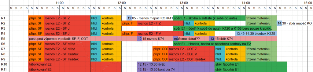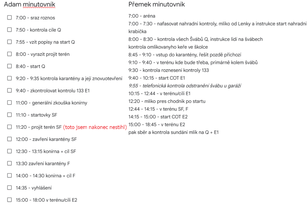 Během pátku se do terénu rozmístilo 95% všech červenobílých pásek a rozvezlo několik plotů, aby toho v sobotu bylo na práci co nejméně. Sešli jsme se před sedmou a krátce poté už vyráželi roznašeči do prostoru. Asi nemá smysl detailně popisovat, jak probíhal celý den, protože to by byl tento článek ještě 2x delší. Pro ukázku, jak jsme se s Přemkem na den připravovali sem přidám alespoň naše minutovníky, kde jsme si označili kdo kde a kdy bude, což jsme si pak během dne odškrtávali jako hotové.