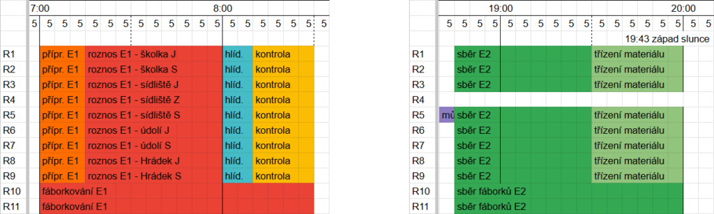 V minulé kapitole jsem zmiňoval překryv etap mezi sebou, to ale znamená, že musí být obě etapy roznesené zároveň. Vše obstarával jeden roznosový tým pod vedením Pepy Sabola, pro kterého jsem si připravil nelehký úkol. Nejdřív bylo potřeba roznést 87 kontrol na dopolední závod, ale ty se mohly posbírat až po uzavření cíle E1. V tu dobu už se ale běhalo semifinále, takže po roznosu Q+E1 bylo dále potřeba roznést 69 kontrol na odpoledne a až poté bylo možné sbírat dopolední a následně večer i odpolední závod.